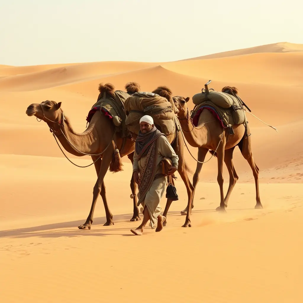 رجل مسافر في الصحراء يجر خلفه 3 جمال