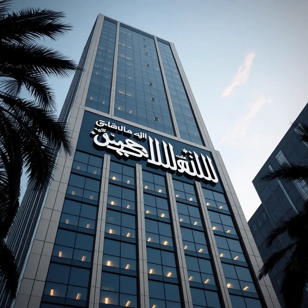اريد صورة مبنى شاهق ومكتوب عليه شاكر التعمري باللغة العربية المزغرفة وهي شركة ضخمة