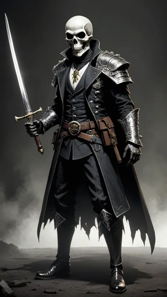 جمجمة تضحك ضحكة مرعبة وترتدي ملابس مرعبة وتمسك سيف حاد في الليل