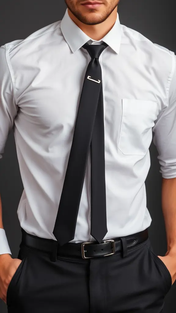رجل يرتدي قميص ابيض مع رباط اسود مع بنطلون قماش اسود