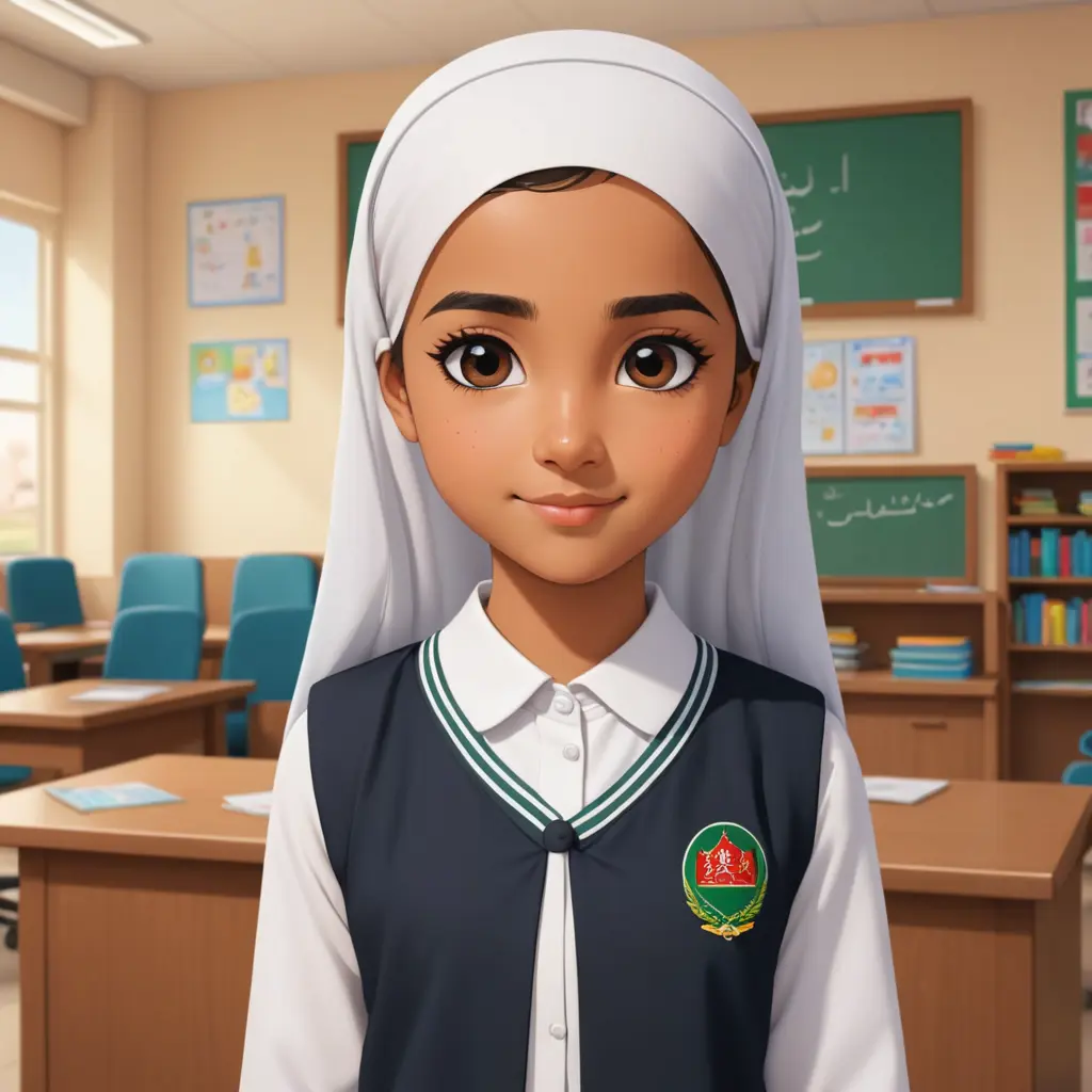 صوره بنت بالزي المدرسي العمانيه متحجبه شخصيه كرتونيه وخلفيه مدرسه خلفها