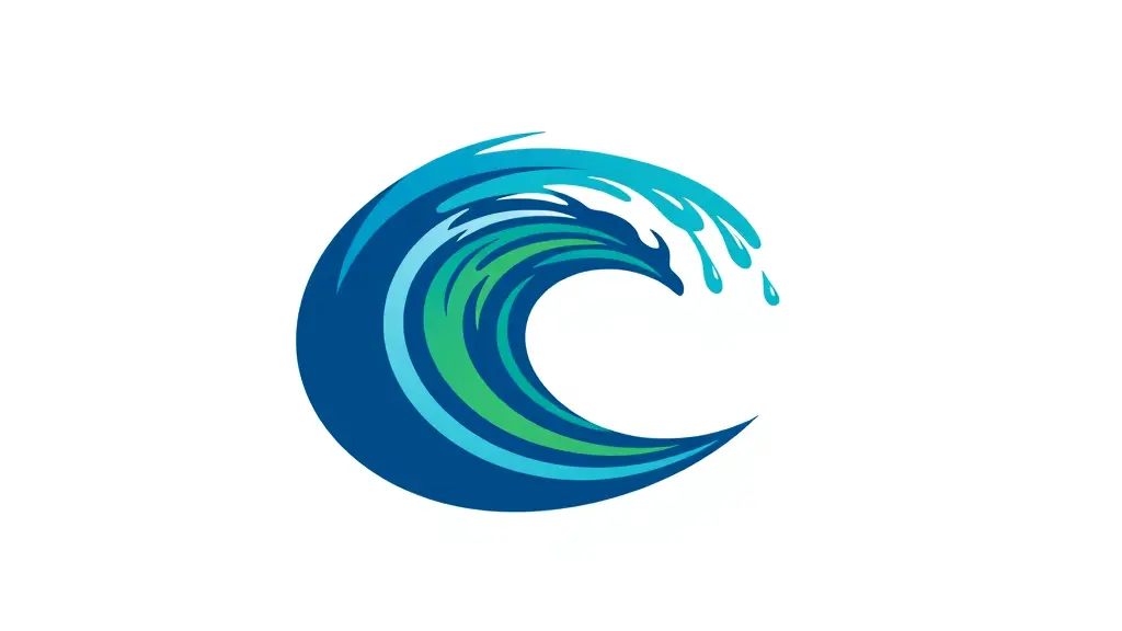 شعار موجة غير متناظر لماركة ركوب أمواج، بتدرجات الأزرق والأخضر والأبيض، تصميم عصري