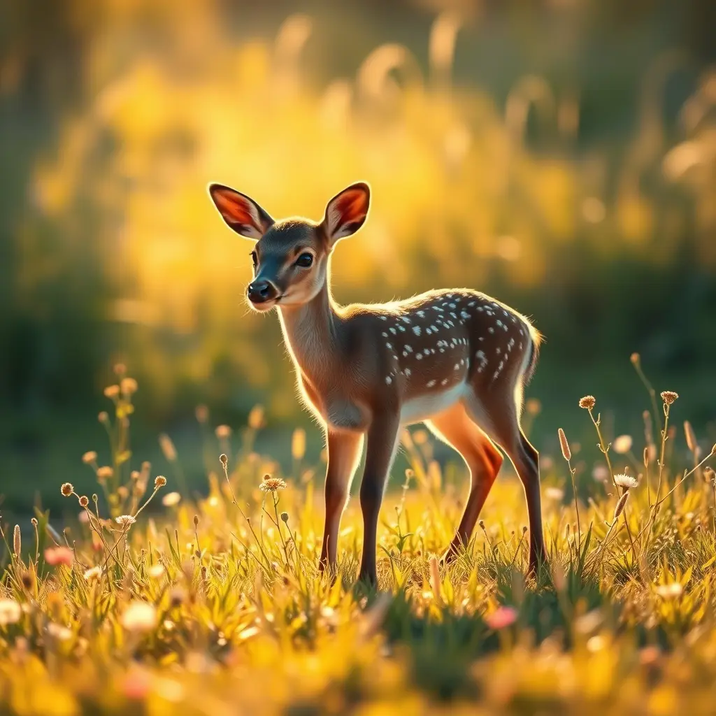 غزالٌ صغيرٌ رقيقٌ يقف في مرجٍ مُشمس، مُحاطًا بأزهارٍ بريةٍ وعشبٍ يرعى. يغمر المرج ضوءٌ ذهبيٌّ دافئٌ في وقتٍ متأخرٍ من بعد الظهر، يُلقي بظلالٍ ناعمةٍ تحت النسيم العليل. صُوِّر المشهد بأسلوبٍ رقميٍّ مُفصَّل، بألوانٍ زاهيةٍ وتفاصيلَ مُعقَّدة، مُبرزًا جمالَ الطبيعة وسكينتها.