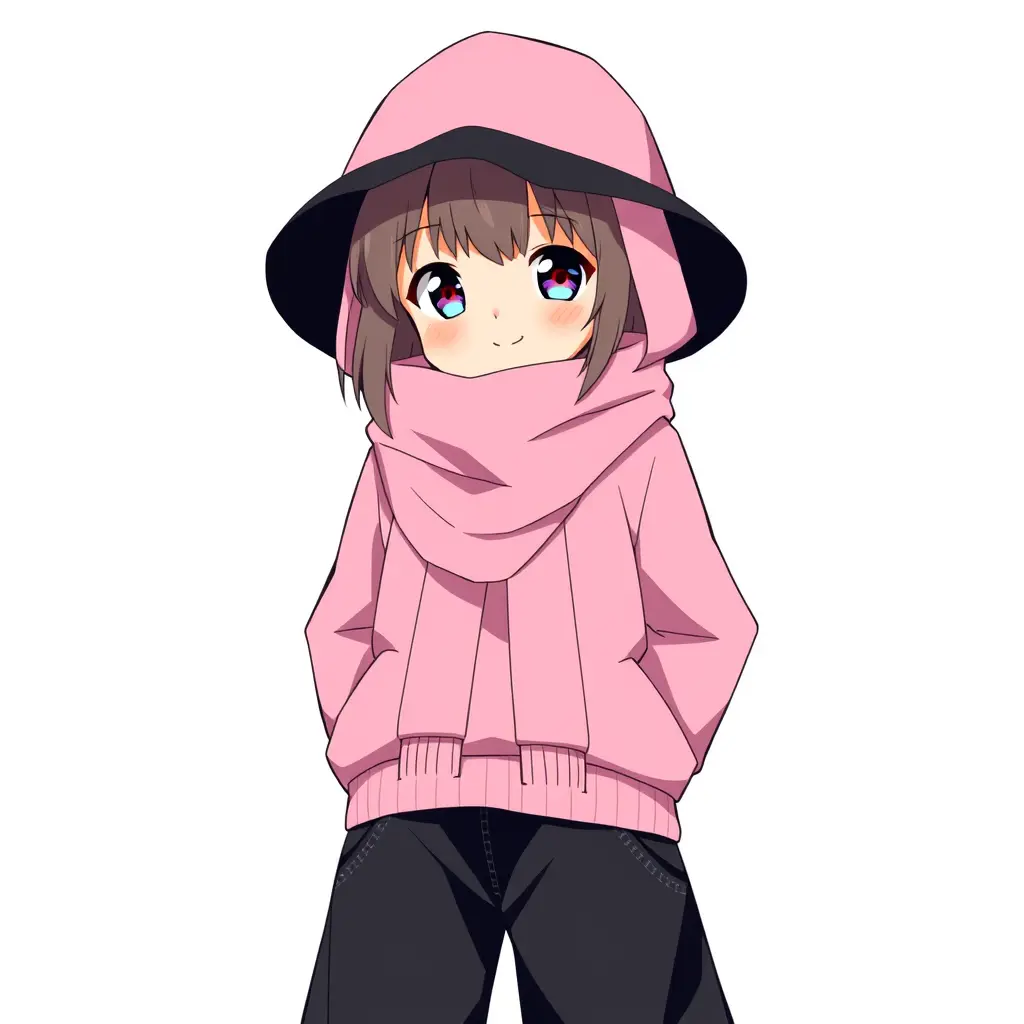 بنت لابسه هودي زهري وبنطال اسود عريض ولابسه شنته سوداء وحشاء زهري. وتبتسم بنت تكون رسوم انمي اريد ان تقف كامله ويبين حذائها