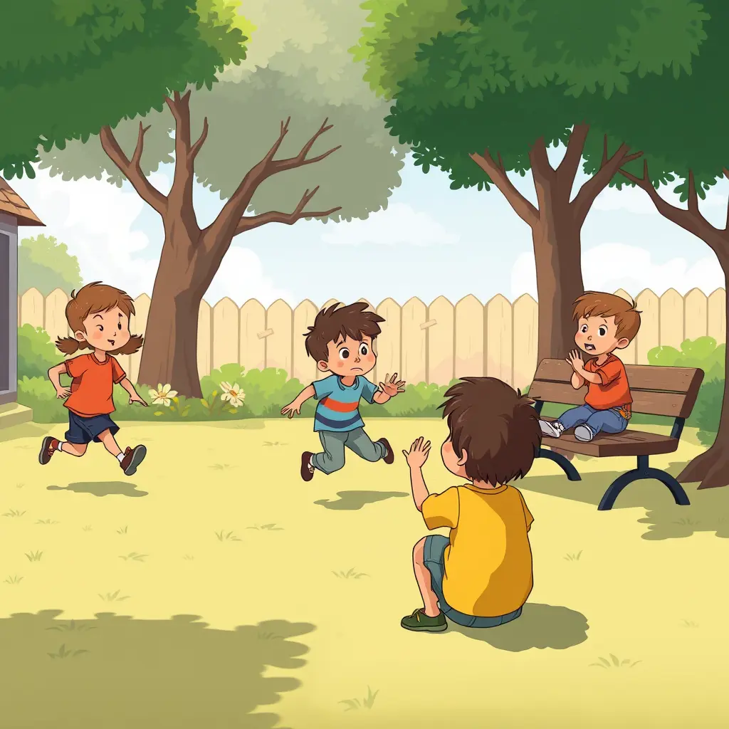 بأسلوبانميكوميك لمجموعة من الأطفال يلعبون في ساحة مفتوحة. الأطفال يركضون ويلهون مع بعضهم في جو مرح. في زاوية الصورة، يظهر طفل يدعى ضامر يجلس وحيدًا، يبدو عليه الحزن والتردد. ضامر يجلس بعيدًا عنهم على مقعد أو على الأرض. أحد الأطفال في الصورة ينظر إليه بابتسامة ويدعوه للانضمام إلى اللعب، ملوحًا بيده وداعيًا إياه للمشاركة."