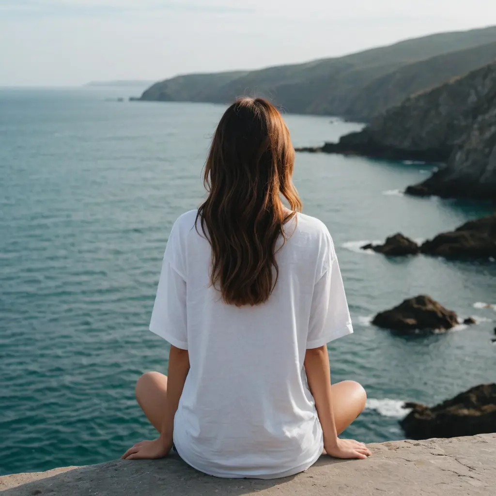 صورة لفتاة ترتدي تيشرت طويل ابيض بكفوف طويلة تجلس بجانب البحر زاوية التصوير من الخلف وشعرها قصير وبشرتها بيضاء