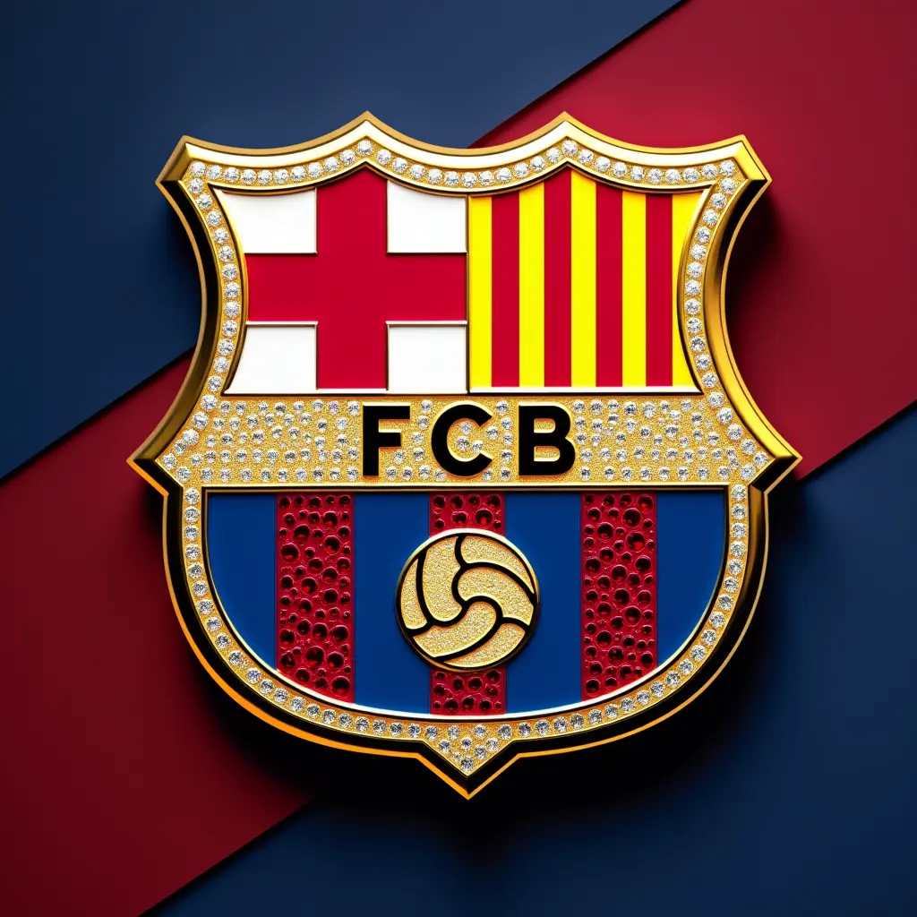 شعار نادي برشلونة  مطلي بالذهب ومرصع بالألماس الفاخر والياقوت وخلفيته مكونة من لونين الأحمر والأزرق  ومكتوب بالأسفل برشلونة عم الجميع مصممة بدقة عالية 8H
