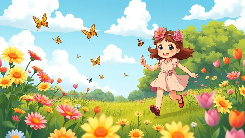 تظهر الفتاة الصغيرة في حقل مليء بالزهور المتفتحة بألوان زاهية، مثل الأقحوان والتوليب. ترتدي فستانًا زهريًا فاتحًا وتضع إكليلًا من الأزهار على رأسها. الفراشات تحلق حولها، والسماء زرقاء مع غيوم بيضاء ناعمة. في الخلفية، أشجار خضراء مورقة وبعض الطيور المغردة. الفتاة تركض بسعادة وهي تحاول الإمساك بفراشة. كرتون
