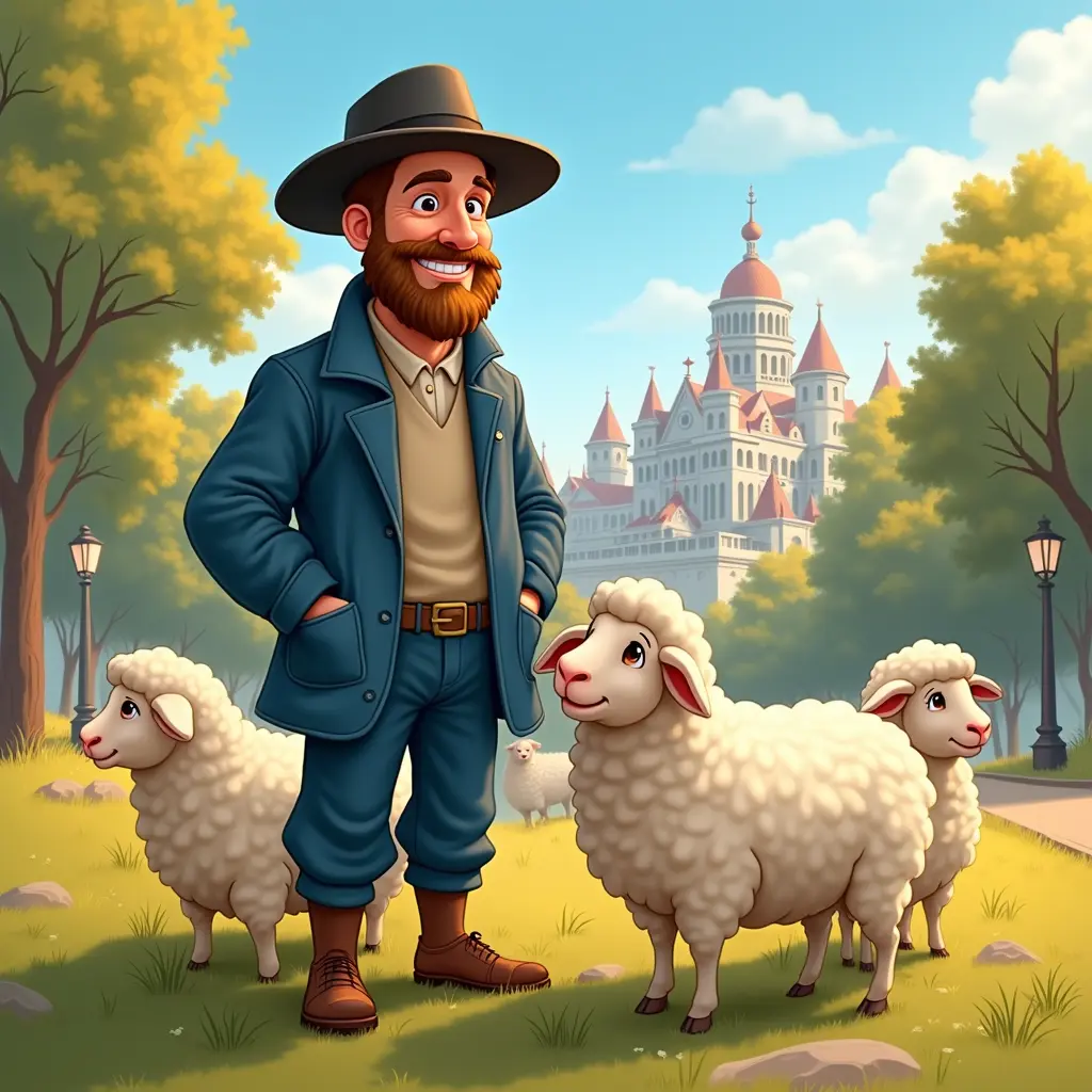 راعي غنم مبتسم بإشراقة دافئة في سن الاربعينات، يحيط به خروف لطيف ذو صوف كثيف، يقف في مشهد طبيعي هادئ ومشرق. في الخلفية، يظهر منظر لمدينة حضارية بمبانٍ أنيقة تنسجم مع الطبيعة المحيطة. ألوان اللوحة دافئة وجميلة، تعكس أجواء مليئة بالبهجة والسكينة، مع سماء زرقاء صافية وإضاءة ذهبية تضفي لمسة حيوية على المشهد. أسلوب الرسمة مستوحى من الرسوم المتحركة ديزني، بخطوط ناعمة وتفاصيل متقنة تضفي سحراً خاصاً. يرتدي الراعي سترة زرقاء وسروالاً ازرق، مع لحية خفيفة جداً وقبعة سوداء، ما يمنحه مظهراً جذاباً وحضاري يتناغم مع المشهد الطبيعي، يقف على ارضية فيها عشب ورصيف المدينة
