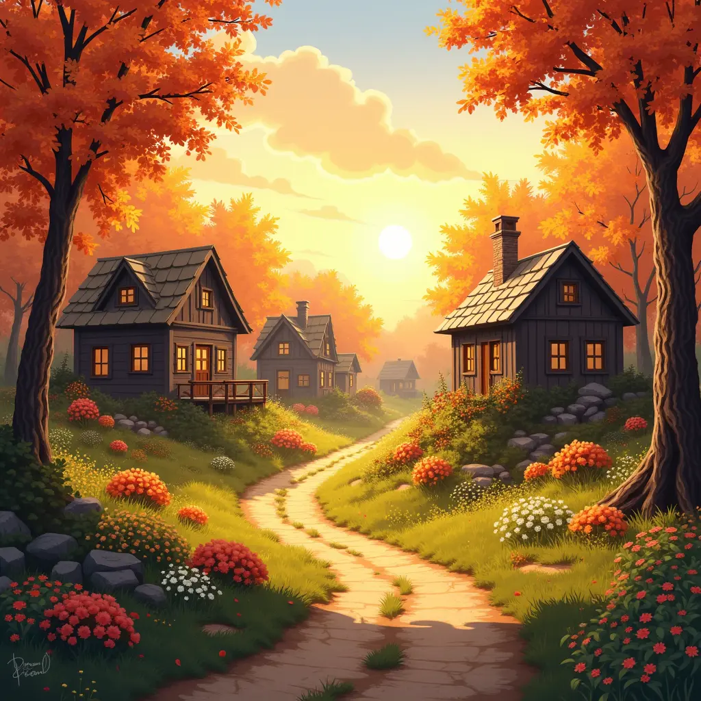 Bright autumn landscape, digital painting, cozy village, wooden houses, rustic charm, winding dirt road, warm golden sunset, orange and yellow hues, lush foliage, blooming flowers, serene atmosphere, soft mist, picturesque landscapes, detailed textures, whimsical style, fantasy setting, peaceful countryside, charming village, alluring, nature, idyllic, scenic beauty, warm light, peaceful mood