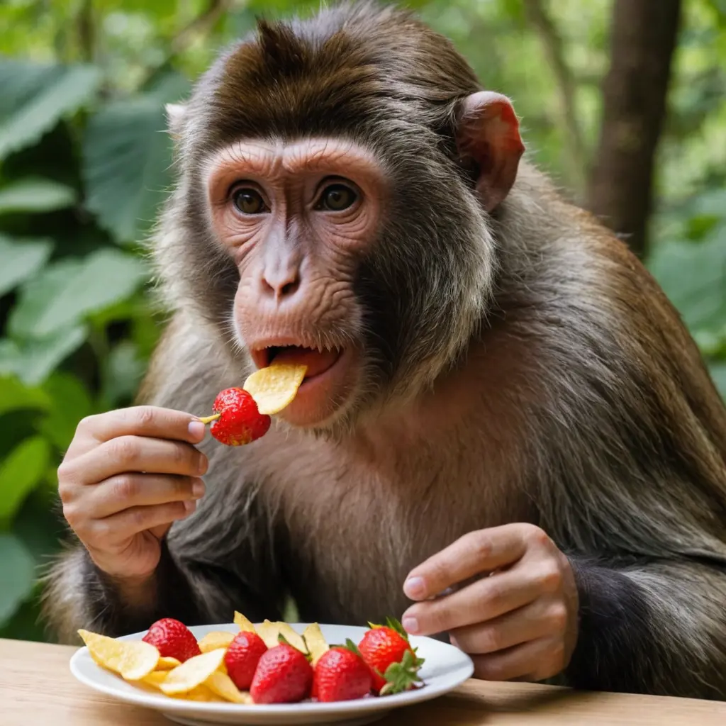 رجل ياكل فراولة وأمامه قرد ياكل شيبس