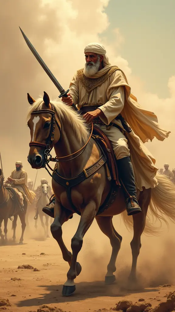 رجل عربي قديم يحمل سيف وراكب على حصان في معركة اريد الرسمة بالوان خشبية