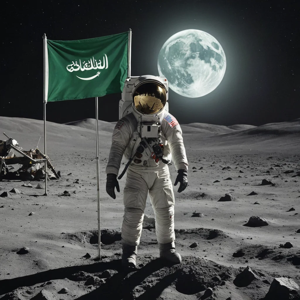 صورة بوستر فلم رجل فضائي على سطح القمر و بيديه علم السعودية  مغروس على القمر