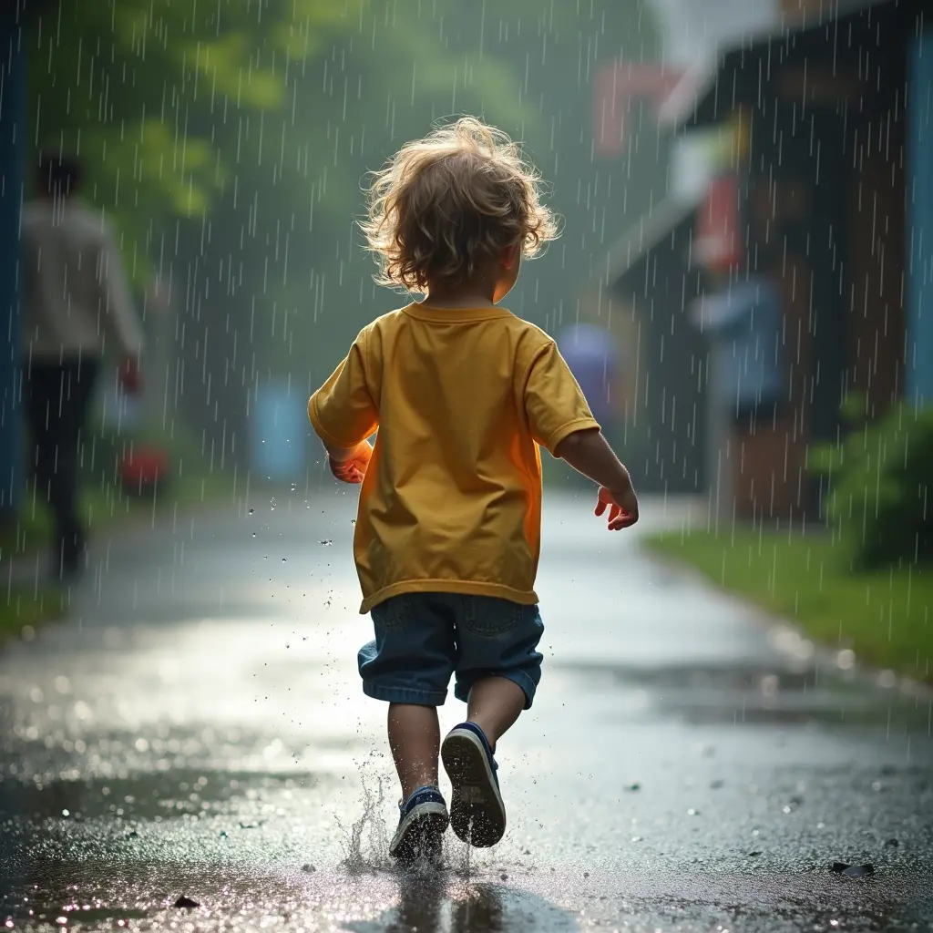 صورة طفل يجري تحت المطر