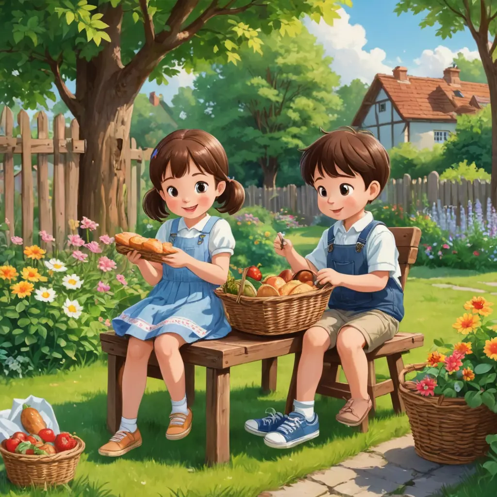 الطفل و الطفلة يجلسان في الحديقة على كرسي خشبي يأكلان الطعام الذي في السلة..ذات الطفلان السابقان..استخدم نمط الكرتون