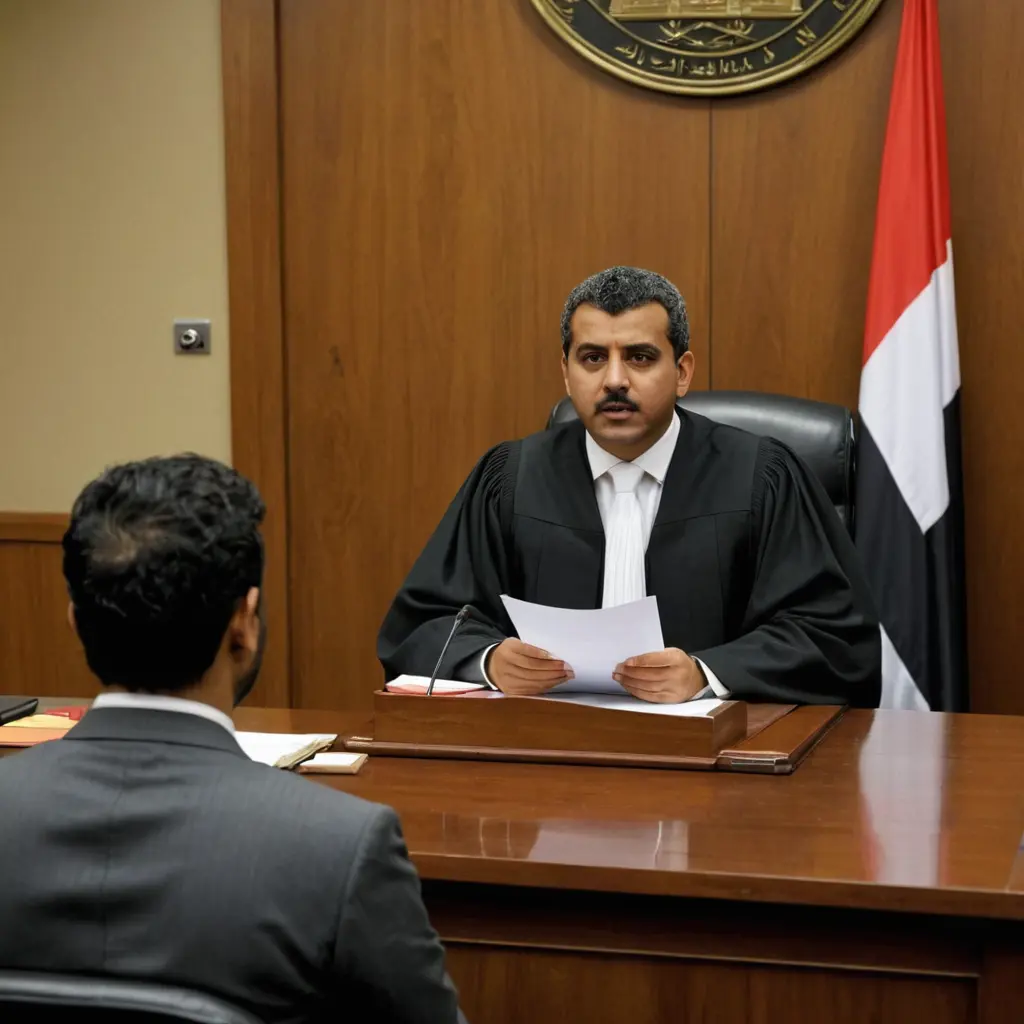 صورة محامي يترافع امام قاضي في المحكمة وخلفة علم دولة اليمن