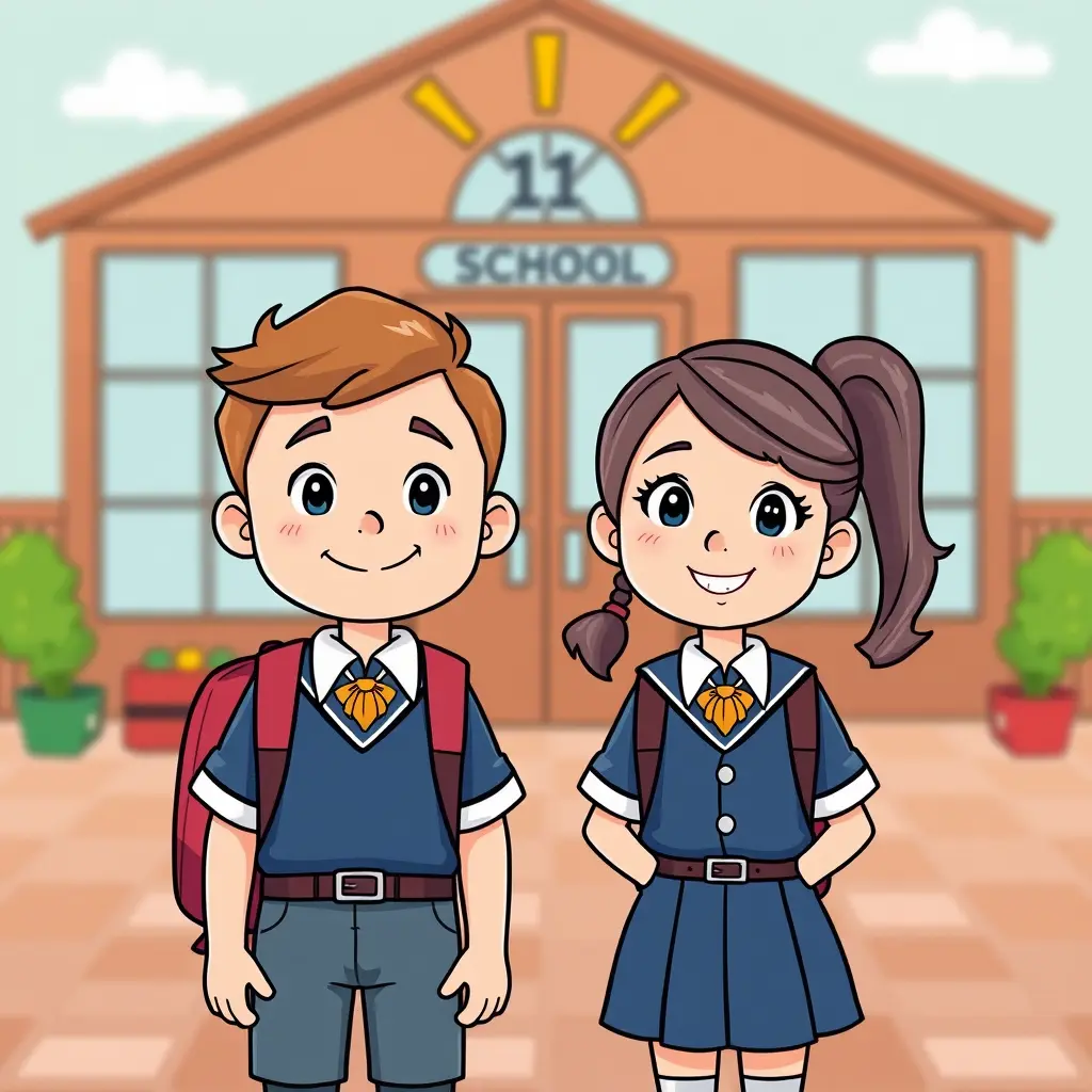 اطفال كرتون والخلفية مدرسه اجعل الاطفال ولد وبنت في الحادية عشرة من عمرهم يرتدون زي مدرسي ويبدو عليهم السرور