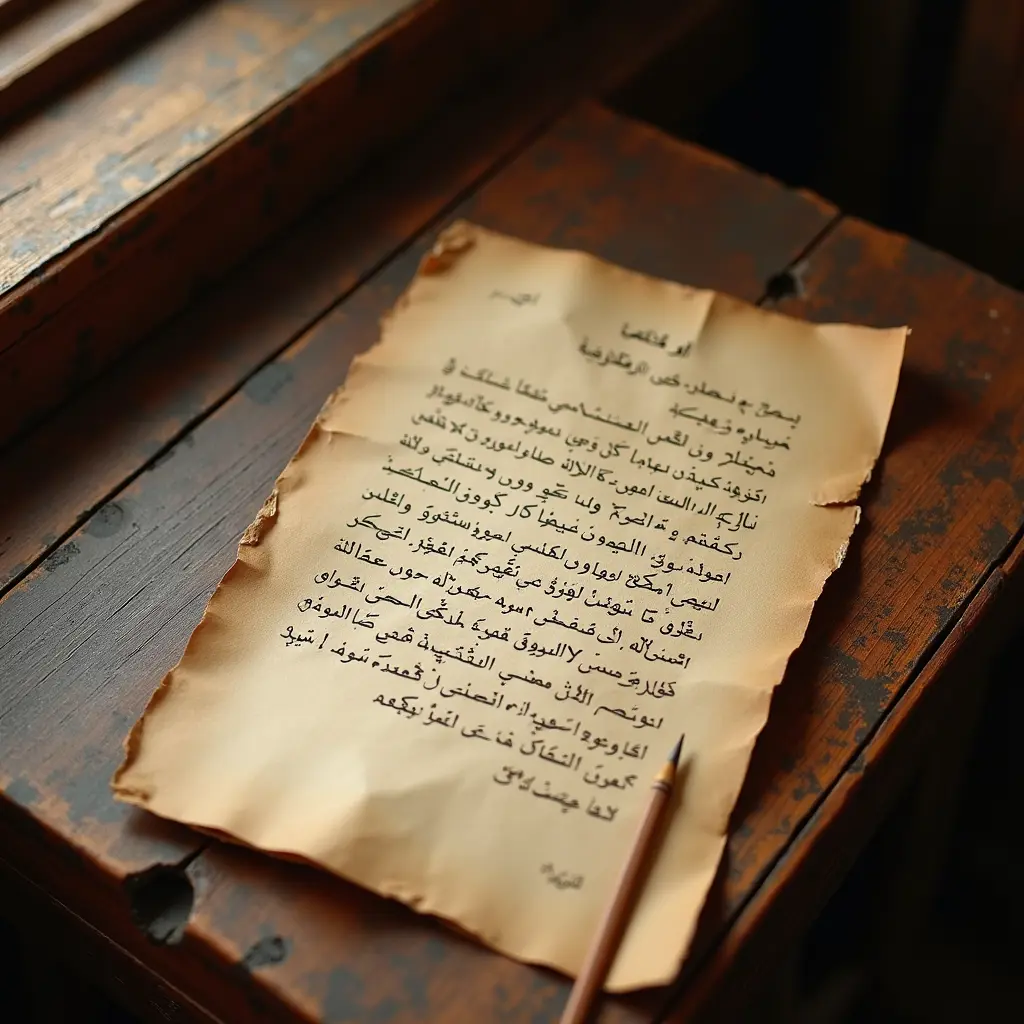 رسالة ورقية قديمة من السنة 3 هجرية مكتوب عليها بالعربية على مكتب قديم من الخشب
