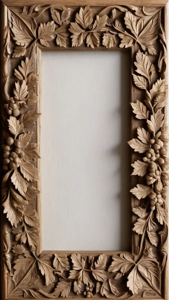 برواز حفر على الخشب منحوت عليها ورق عنب وسنابل قمح ابيض واسود