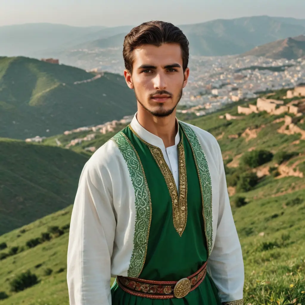 شاب وسيم بلحية خفيفة يرتدي زي تقليدي جزائري يقف على تلة خضراء