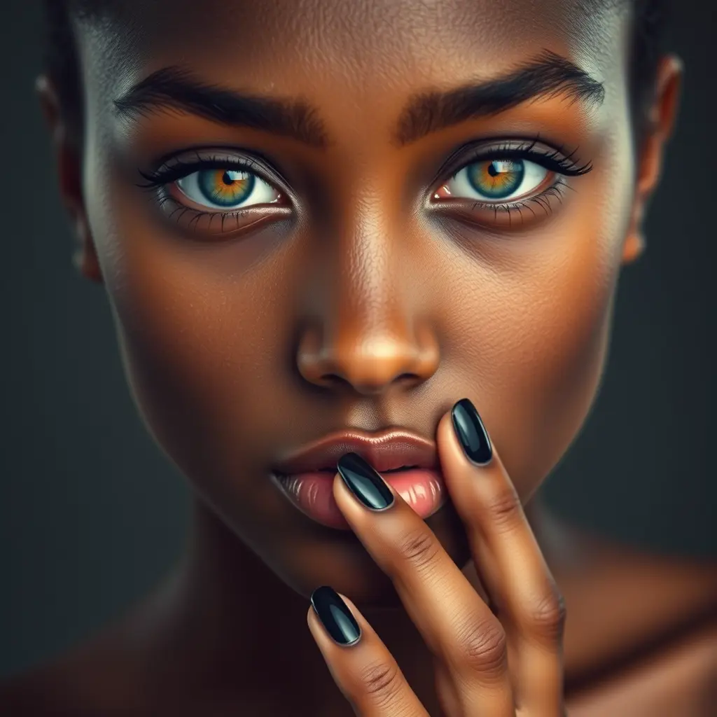 صورة بنت سمراء بعيون ملونة يجسد نحيف وطلاء اضافر القدمين بللون الاسود