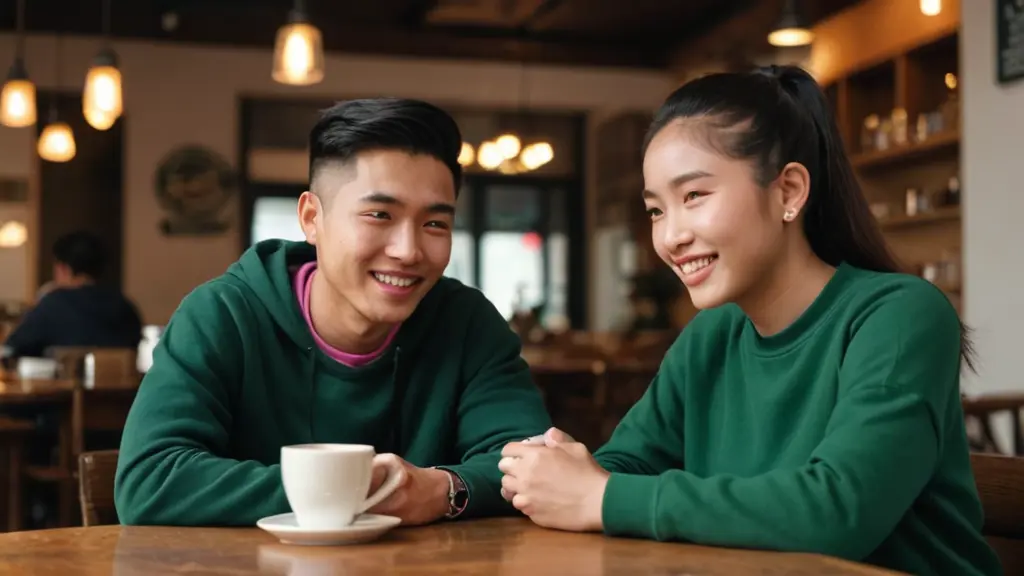"A young Asian man with a taper fade and textured top hairstyle, wearing a dark green sweatshirt, sits at a cozy café table. His hands are resting on his cheeks while listening eagerly. His eyes are fixed on his girlfriend, who sits across from him wearing a pink cold-shoulder top, speaking with joyful energy. She gestures animatedly, her face lit up with excitement as she shares a story. The warm café ambiance, with soft lighting, wooden tables, and the gentle hum of background chatter, adds to the intimate and lively atmosphere of their conversation."