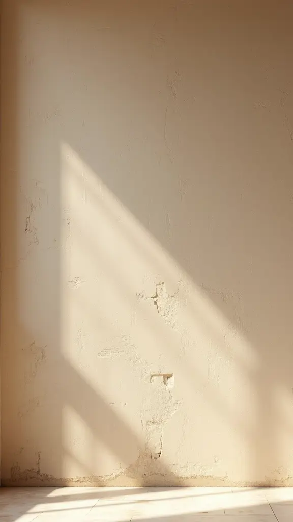خلفيه فقط اللون الأساسي: بيج مائل للرمادي (رملي فاتح) بدرجات متفاوتة، يوحي بالهدوء والدفء، يشبه لون الجدران القديمة في البيوت الأوروبية أو العربية التقليدية. الملمس (الخامة): الجدار يبدو وكأنه مكوّن من جص قديم أو خرسانة ملساء معتقة، مع تفاوتات خفيفة في اللون توحي بالزمن — لا يوجد نقش، لكن ملمس السطح فيه لمسات يدويّة واضحة، مما يعطي إحساسًا واقعيًا عتيقًا. الإضاءة: إضاءة دافئة وخافتة من مصادر جانبية غير مرئية (مثل الشموع أو إضاءة خافتة من الأسفل)، تعكس ظلالًا خفيفة على الحائط وتُظهر تدرجات الملمس بشكل جميل. لا توجد إضاءة ساطعة أو حديثة. الجو العام: الخلفية تعطي إحساسًا بـزمن قديم، كلاسيكي، شاعري، مناسب لأجواء حفلات الزفاف أو جلسات التصوير الرومانسية. تبدو وكأنها داخل مبنى قديم أو قاعة أثرية دون أي زينة. المنظور: الجدار مسطّح، يملأ الخلفية بالكامل دون أي نافذة أو إطار أو عنصر آخر. لا توجد تفاصيل حديثة أو فنية تشتت ا