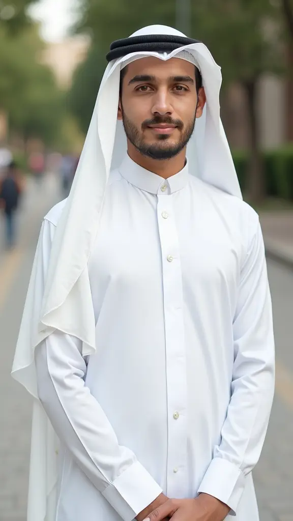 شاب لابس ثوب ابيض وشماغ ابيض مع بوشت بطريقة رسمية مثل العريس