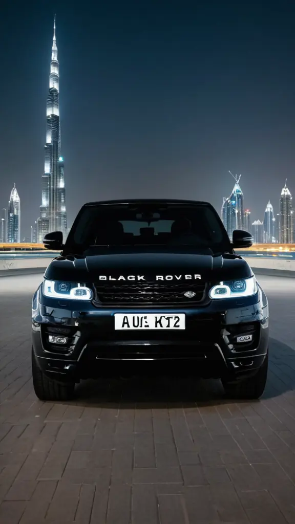 سيارة رانج روفر سبورت لونها اسود و أضوائها زرقاء الساعة العاشرة ليلاً أمام برج خليفة