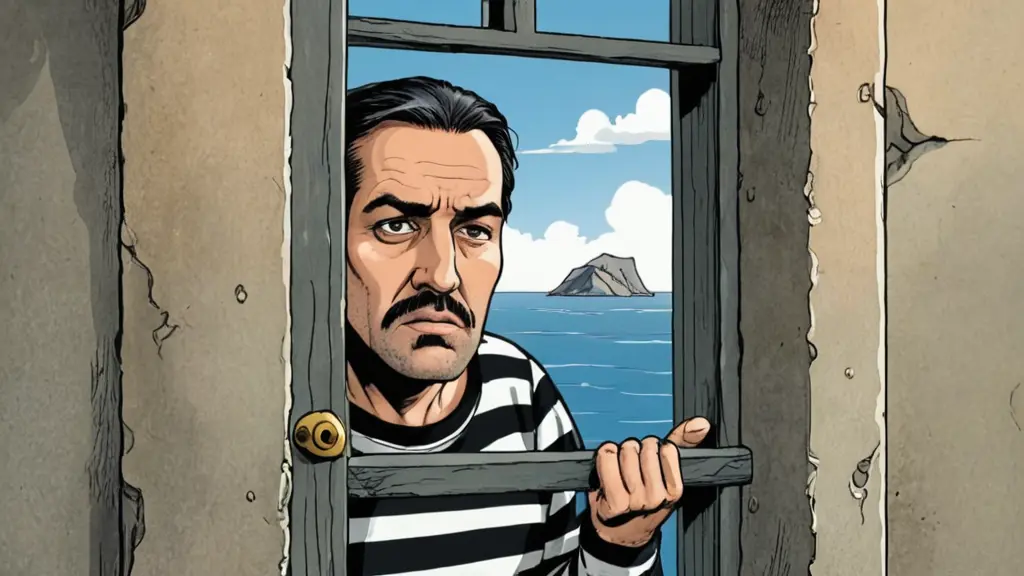 "رجل يرتدي زي السجناء يقف داخل زنزانة صغيرة، ينظر من نافذة ضيقة إلى البحر، بينما تظهر على وجهه ملامح الحزن والقوة." كرتونية