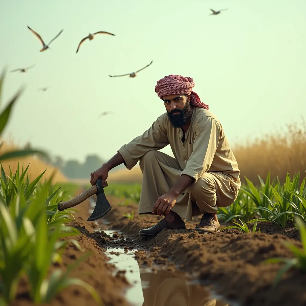 طارق فلاح فى ارض زراعية .مرتديا جلباب مزارع . يمسك بيديه الفاس للعمل بالزرع راكعا للعمل فى الارض بوجه جانبى ينظر الى الكاميرا .فى ضوء نهارى طبيعى. تصوير سينمائى غاية الوضوح . وفى السماء عصافير .مع الاهتمام بتفاصيل الشخصية. بكاميرا امامية. وكل تفاصيل البيئة الزراعية من زرع وماء