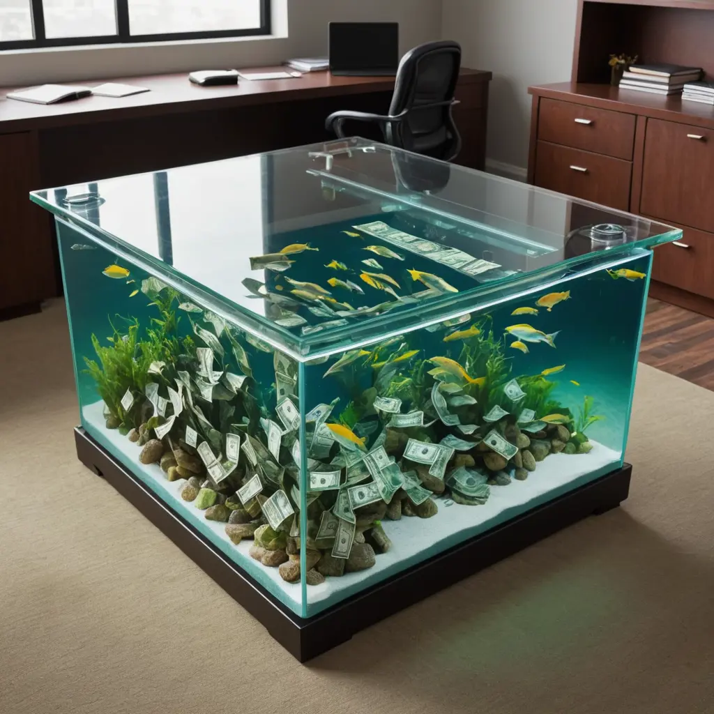 حوض سمك ع شكل طاوله داخله كميه كبيره من الدولارت وره داخل مكتب