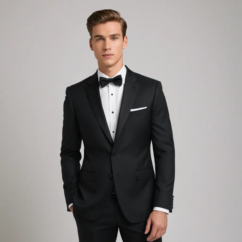 إعطني صورة لرجل غير موجود يرتدي بدلة رسمية سوداء من انشائك يكون متوسط الجمال مع خلفية بيضاء يكون واقف بوضعية التصوير