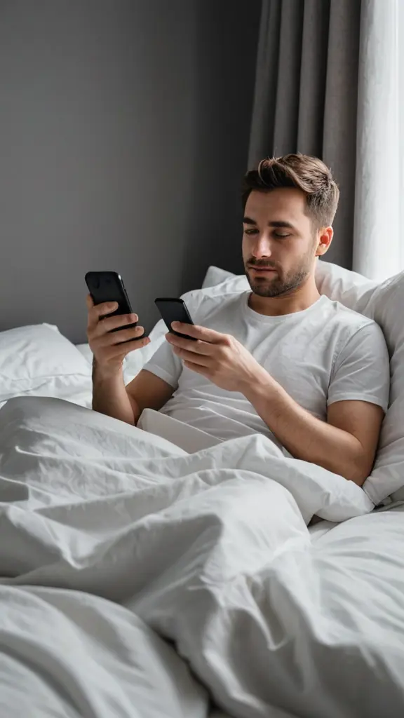 صورة شخص يجلس في السرير ماسك هاتفه وينظر الى الارضيه