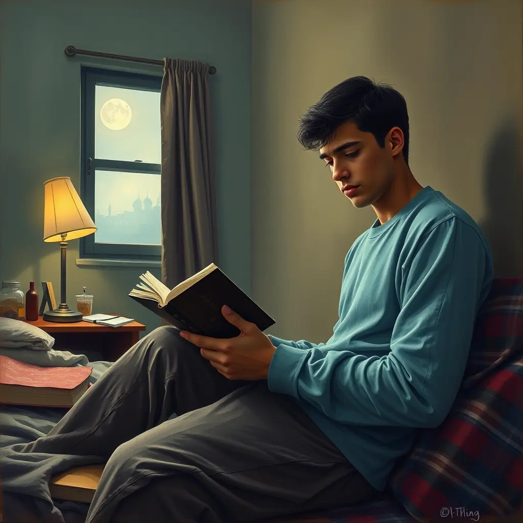 شاب في أوائل العشرينيات من عمره، يرتدي ملابس غير رسمية، يسهر ليالي الجمعة يقرأ الكتب على ضوء خافت لمصباح مكتبي. تدور أحداث المشهد في غرفة نوم متواضعة بنافذة واحدة تسمح بدخول ضوء القمر الخافت، مما يخلق جوًا هادئًا ومريحًا. مع اقتراب الصباح وتسلل أول خيوط الشمس من خلال الستائر، ينهض من فراشه على مضض، وعيناه ثقيلتان من قلة النوم. تصر والدته، التي ترتدي الزي التقليدي، على أن يصلي في المسجد. تلتقطه الكاميرا وهو يشق طريقه بتردد إلى الباب، ثم يسير بسرعة نحو مسجد قريب حيث بدأ المصلون للتو صلاتهم. يصلي لفترة وجيزة ثم يعود إلى غرفته، ويضيف التباين بين إرهاقه وهدوء الصباح الباكر عمقًا إلى المشهد. بأسلوب لوحة زيتية واقعية بإضاءة ناعمة ودرجات ألوان دافئة، مما يؤكد على التعقيد العاطفي للموقف.