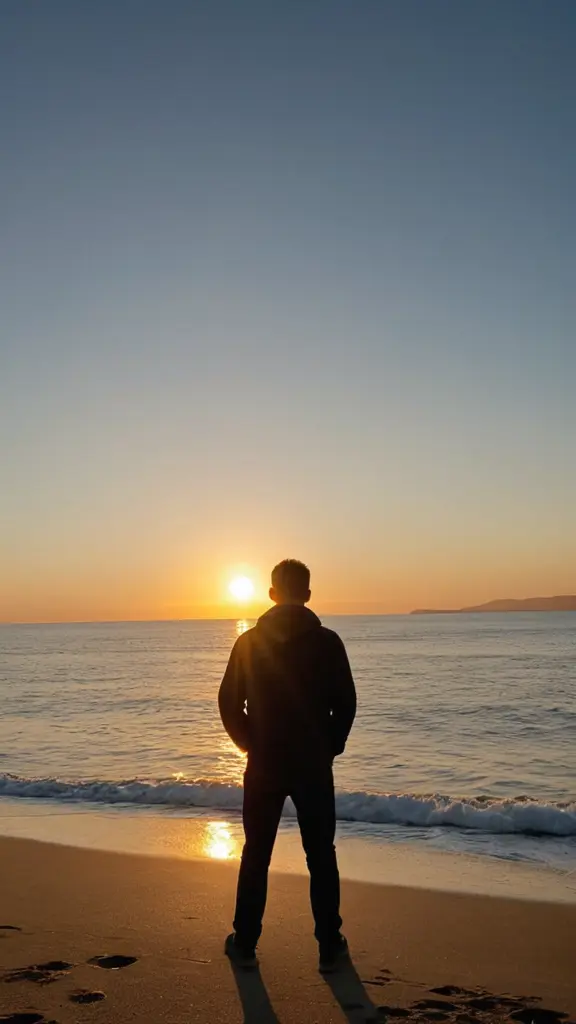 لرجل واقف أمام البحر مع عدسه واسعه وشروق الشمس مع أشعه الشمس الذهبية المخلوطة باللون الاصفر