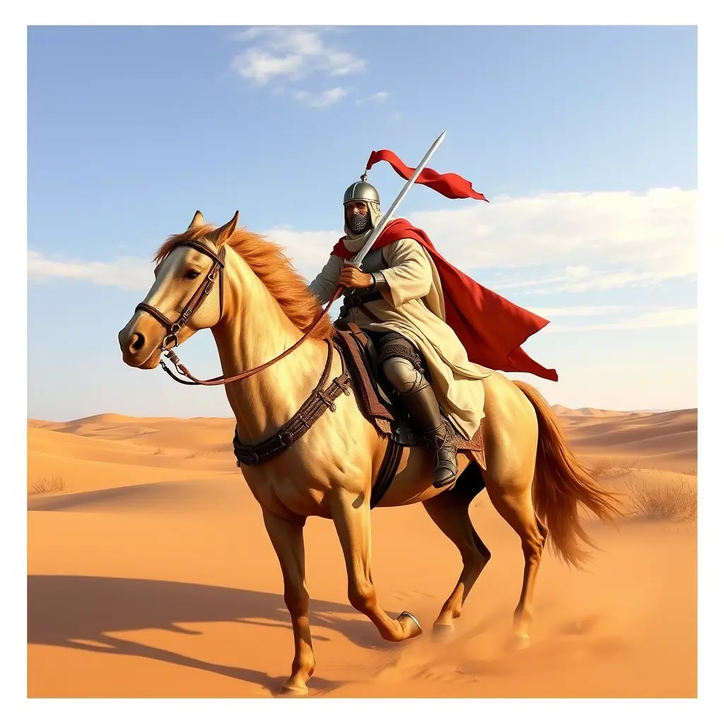 فارس عربي  يركب خيلا ويحمل سيفا في وسط الصحراء