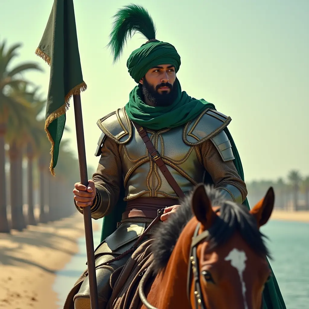 فارس عربي وجهه جميل جدا على رأسه عمامه خضراء وخوذه وفيها ريشتان نعامه خضراء يرتدي درع حربي جلدي ضخم البنيه شاهر السيف بيد والرايه بيد من الزمن العثماني يركب حصان شاهق في ارض  فيها نهر كبير ونخل كثير بجانب النهر  اجعل الصورة ملحميه وواقعيه جدا