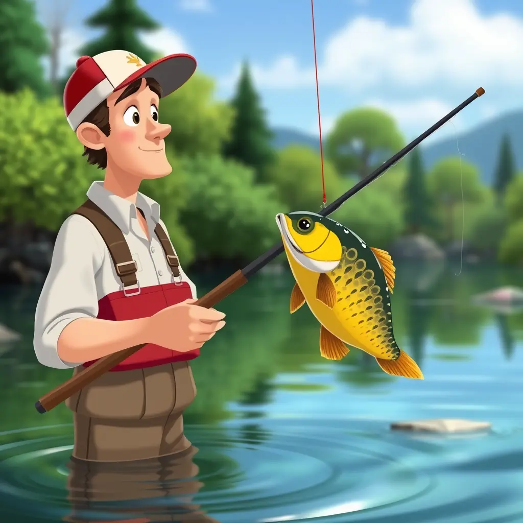 صياد في النهر يرتدي ثياب أحمر و أبيض و في يده صنارة عالقة بها سمكة صفراء و سوداء صورق متحركة