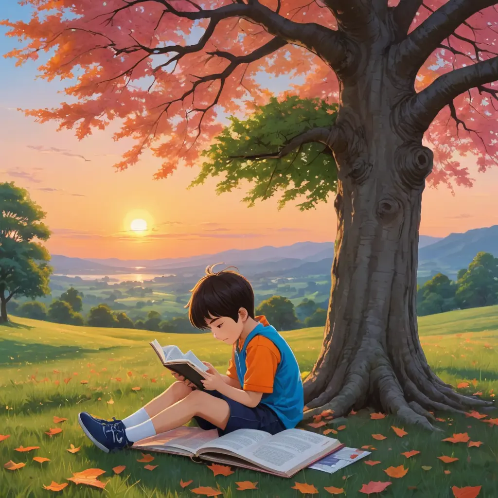 يمكنك رسم صورة لطفل صغير يجلس على الأرض تحت شجرة كبيرة، يقرأ كتابًا بتركيز. اجعل تفاصيل الشجرة والأوراق متقنة لتعكس هدوء وجمال الطبيعة. في الخلفية، ارسم مشهد غروب الشمس مع سماء ملونة بدرجات البرتقالي والوردي. هذا الرسم يعبر عن البراءة، وحب التعلم، والتأمل في جمال الطبيعة. انمي كرتون