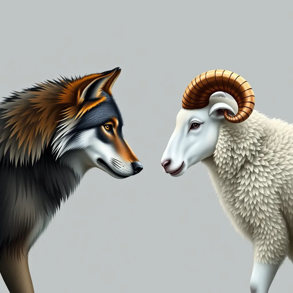 صورة ذئب وخروف بقرون في مواجهة بعض