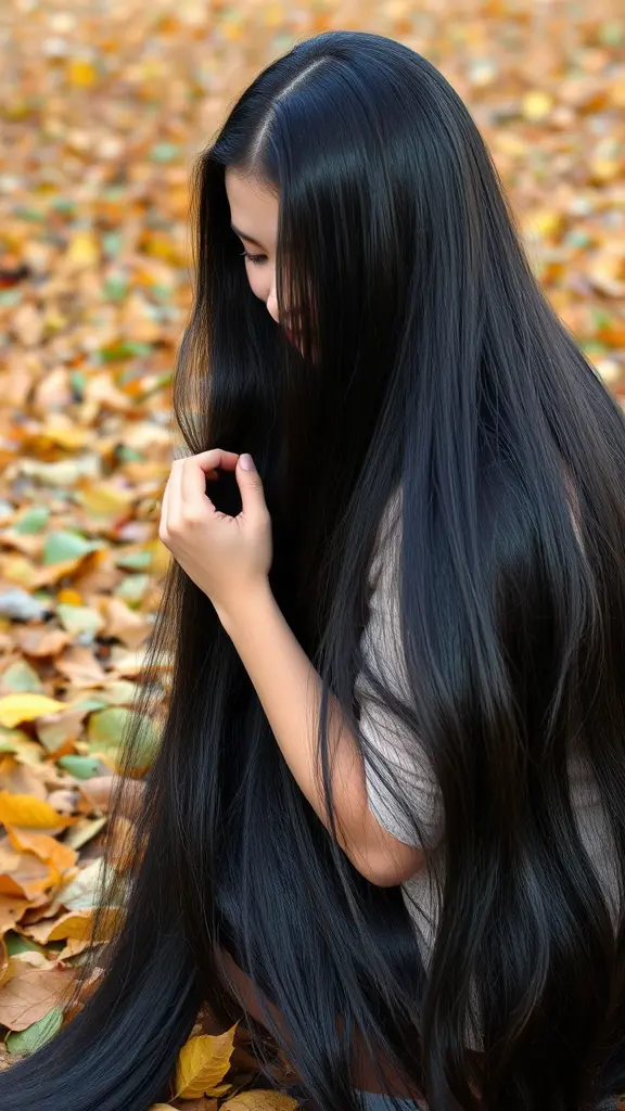 فتاة شعرها طويل اسود وكثيف براق تجمع الأوراق من الأرض و شعرها كثيف جدا ثقيل