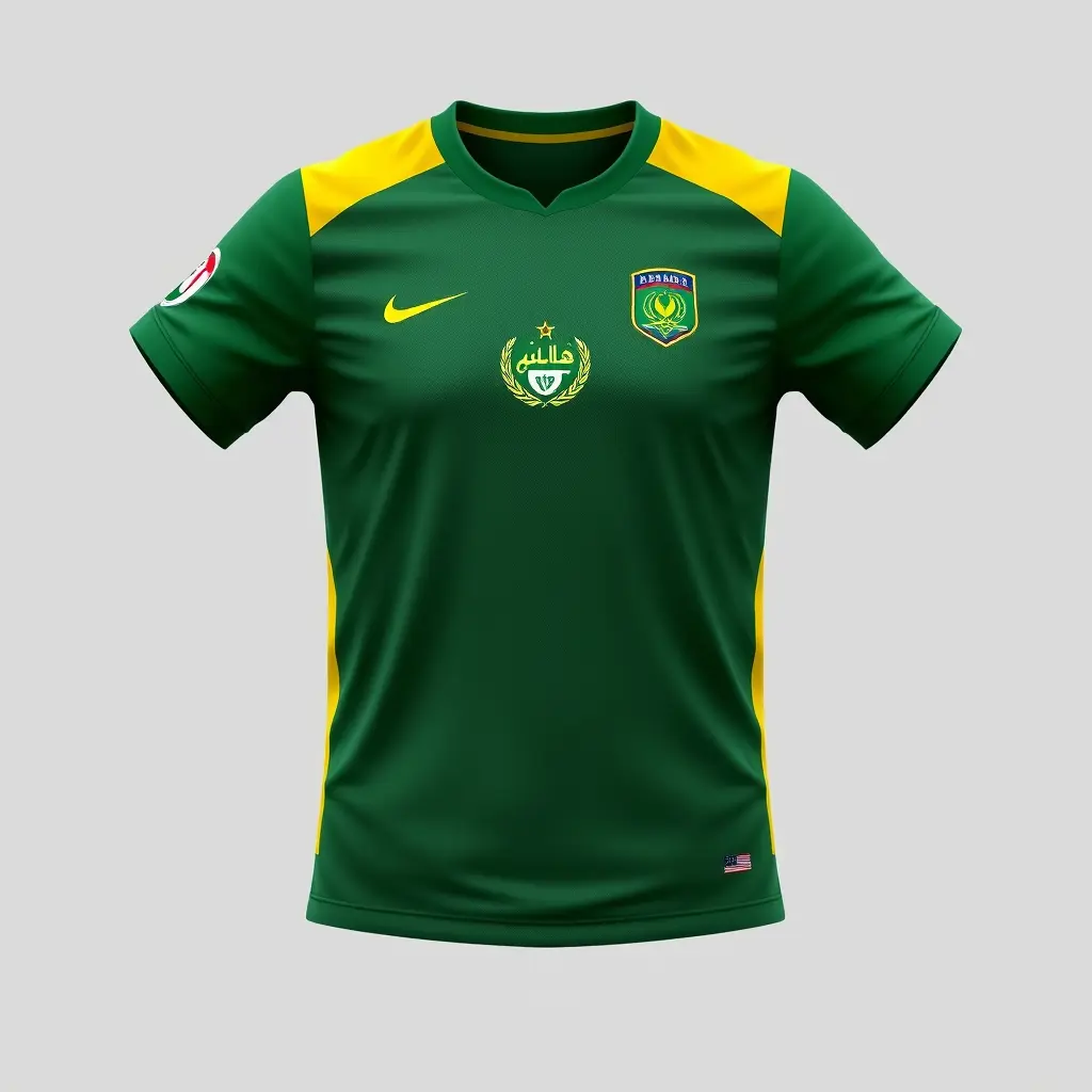 زي رياضي تيشيرت اخضر وعليه دمارات باللون اصفر مع شورت اخضر. وعليه شعار نادي الشرطة العراقي