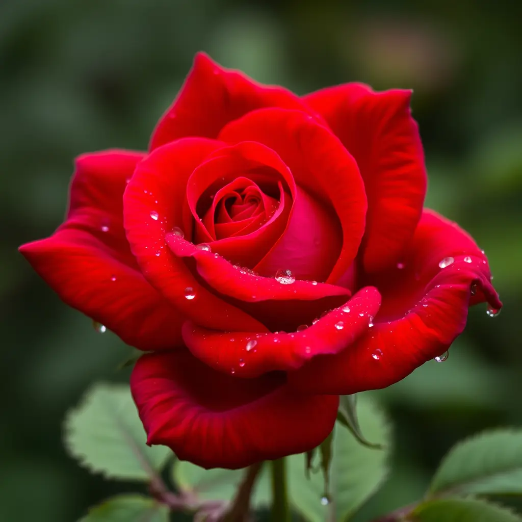 ورده جميله حمراء وقطرات الندى تنزل حواليها