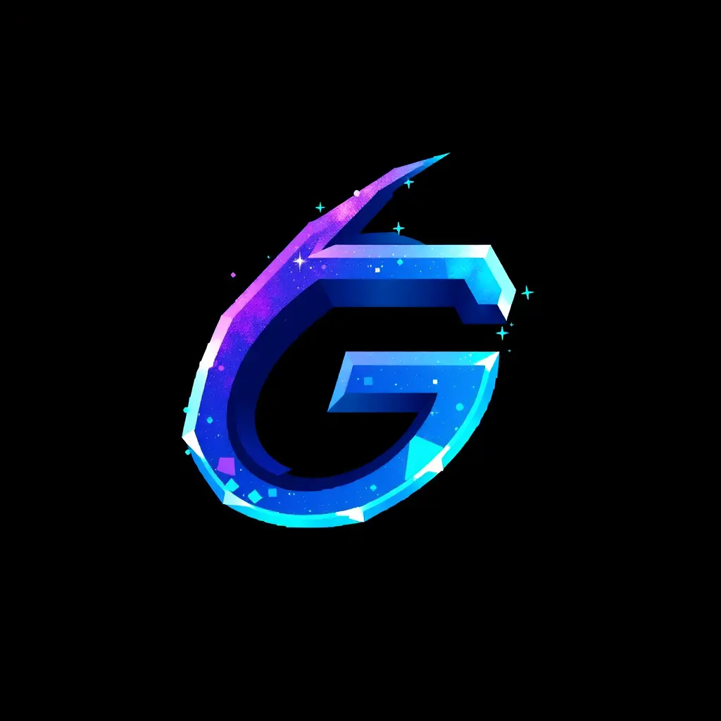 شعار جميل لشركة ألعاب، حرف G مع تأثيرات مجرة، بأسلوب فني حيوي يشبه ألعاب البكسل