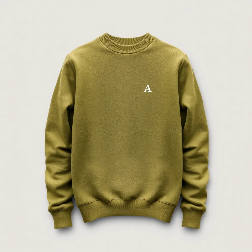 تصميم بلوفر لون زيتي بحرف A يكون صغير والقماش قطن 100% وبدون حبل الي عند الراس وتصميم جميل جدا
