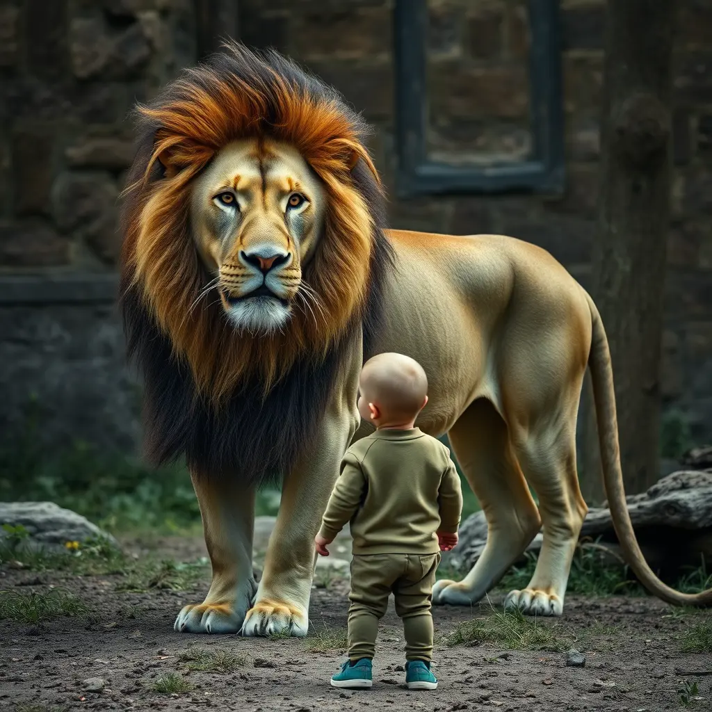 طفل يقف امام اسد