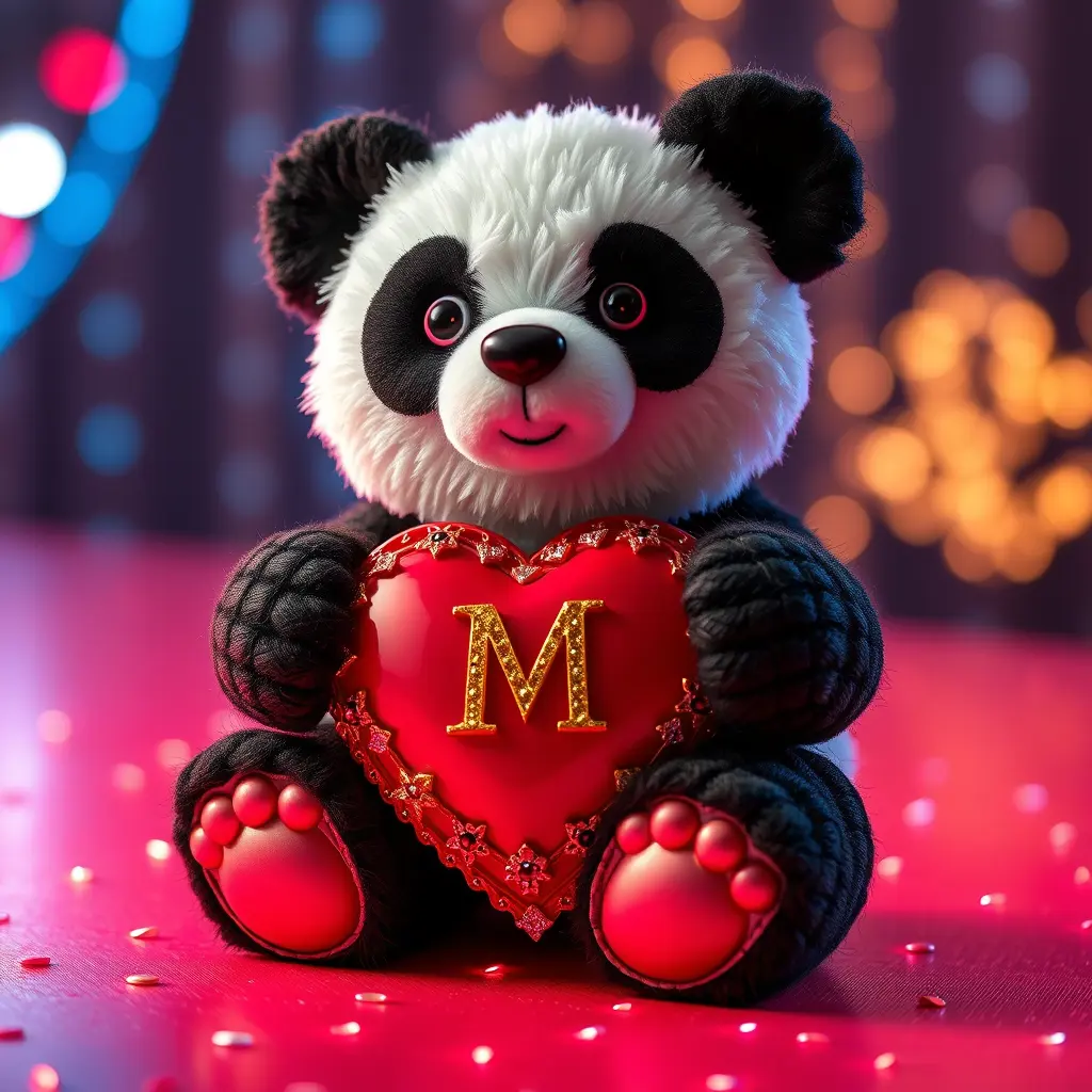 دب باندا قطني كبير على خلفيه إنارة LED احمر و ازرق اللون ،يحمل قلب حب إطاره من مجوهرات ،مكتوب عليه حرف M مزخرف بلون ذهبي ، ثلاثي الابعاد