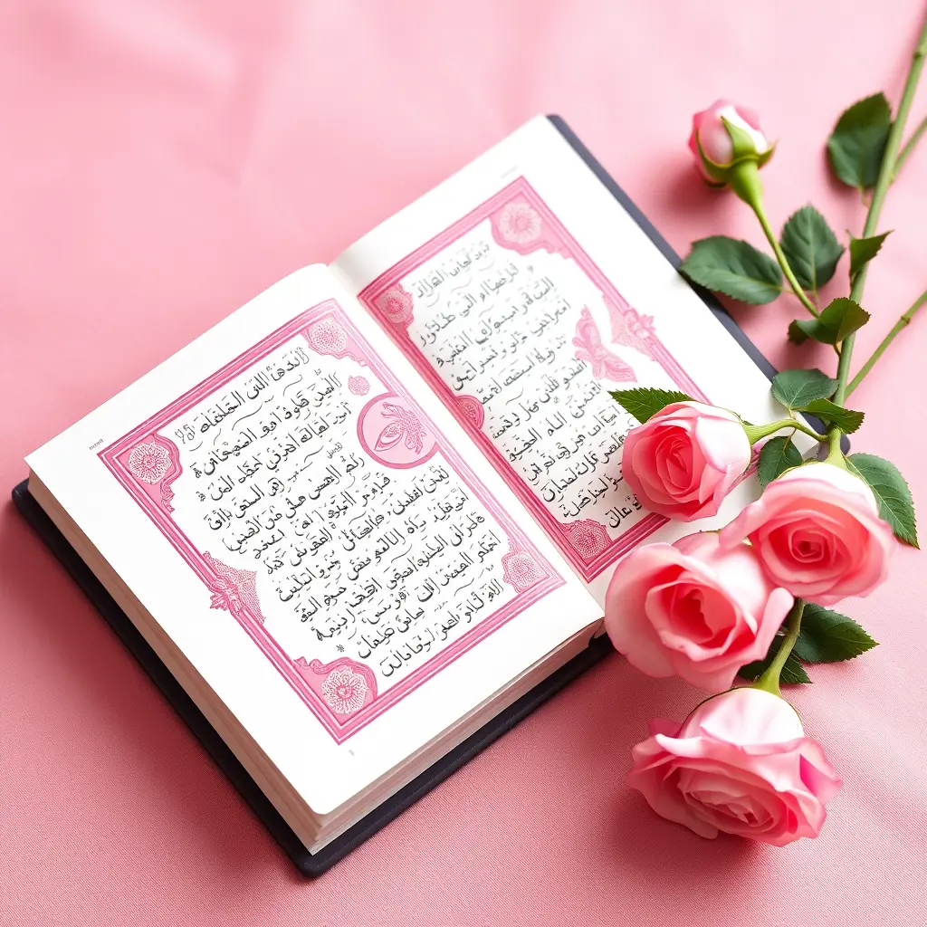 صورة قرآن لونه زهري على طاولة وردية وبجانبه ورود