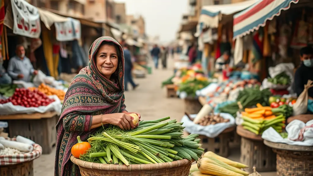 إمرأة ريفية تبيعُ الخضار وسط سوق شعبي عراقي